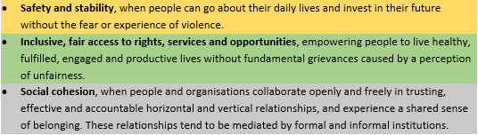 - It incorporates fairness: something people tend to understand far more readily than technical concepts such as ‘inclusion’, ‘marginalisation’ or ‘equity’. (And fairness is a more realistic and achievable criterion than ‘equality’.) Sustainable peace requires that safety, stability and access to opportunity are all fairly available, and the institutions that govern and enable social cohesion should also promote fairness.