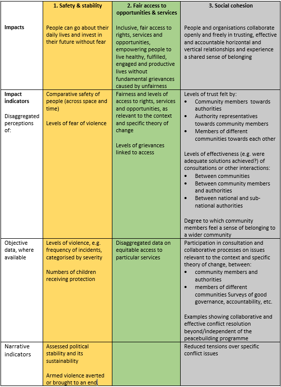 In the following table, each of the three core components of peace are considered separately. In practice, as noted above, there is considerable overlap and interaction between them, which can be taken into account in devising theories of change and M&E elements in actual peacebuilding contexts.